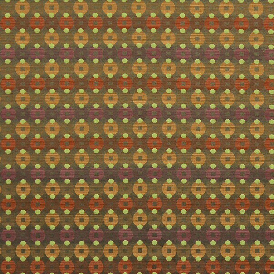 The Grand Circle upholstery fabric features a sophisticated geometric pattern in warm olive, gold, orange,...