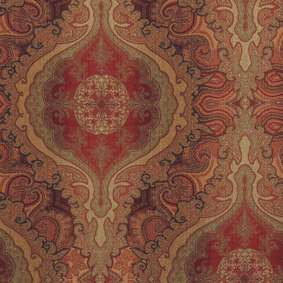 The SOTERO Pomegranate upholstery fabric features rich red, gold, and warm earth tones woven into...