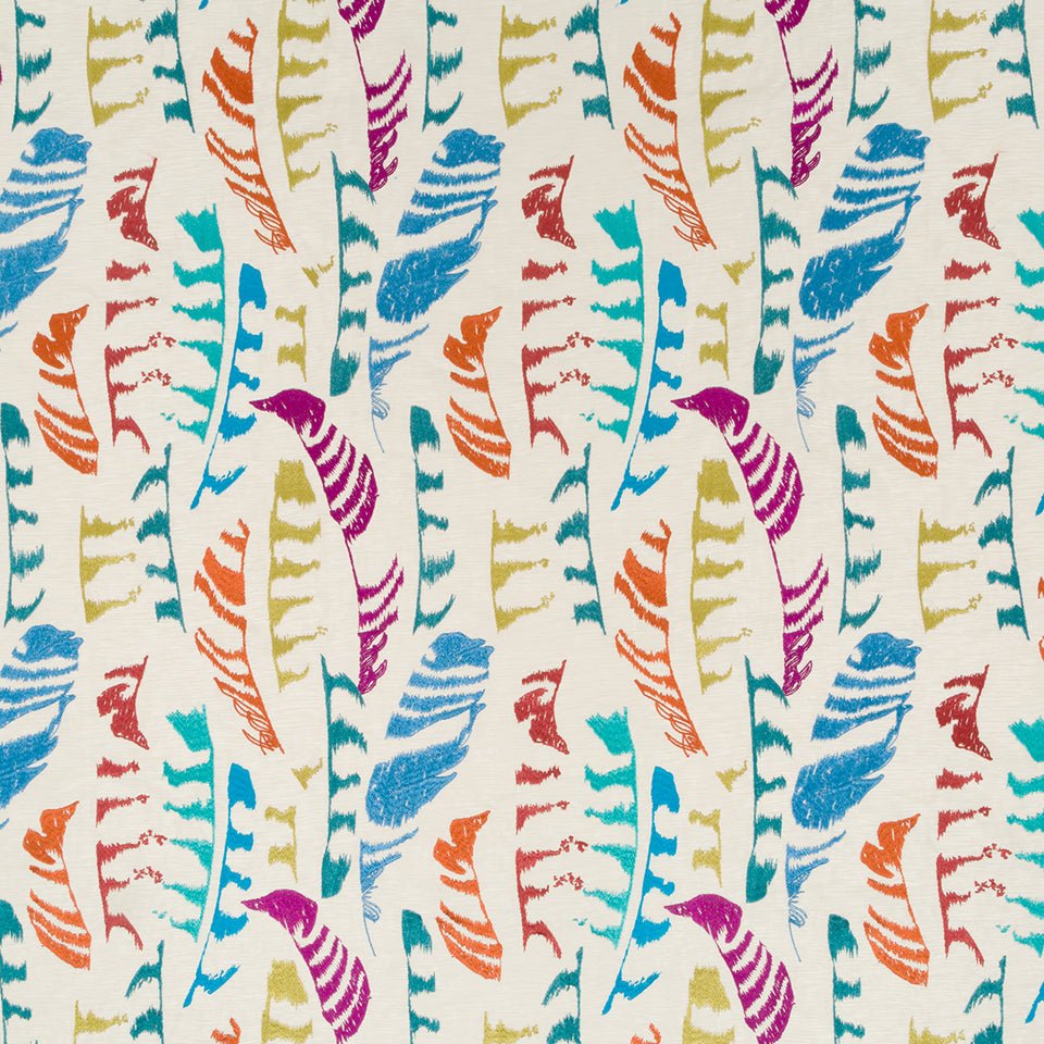The Plume Stitch drapery fabric features a vibrant palette of coral, turquoise, blue, purple, and...