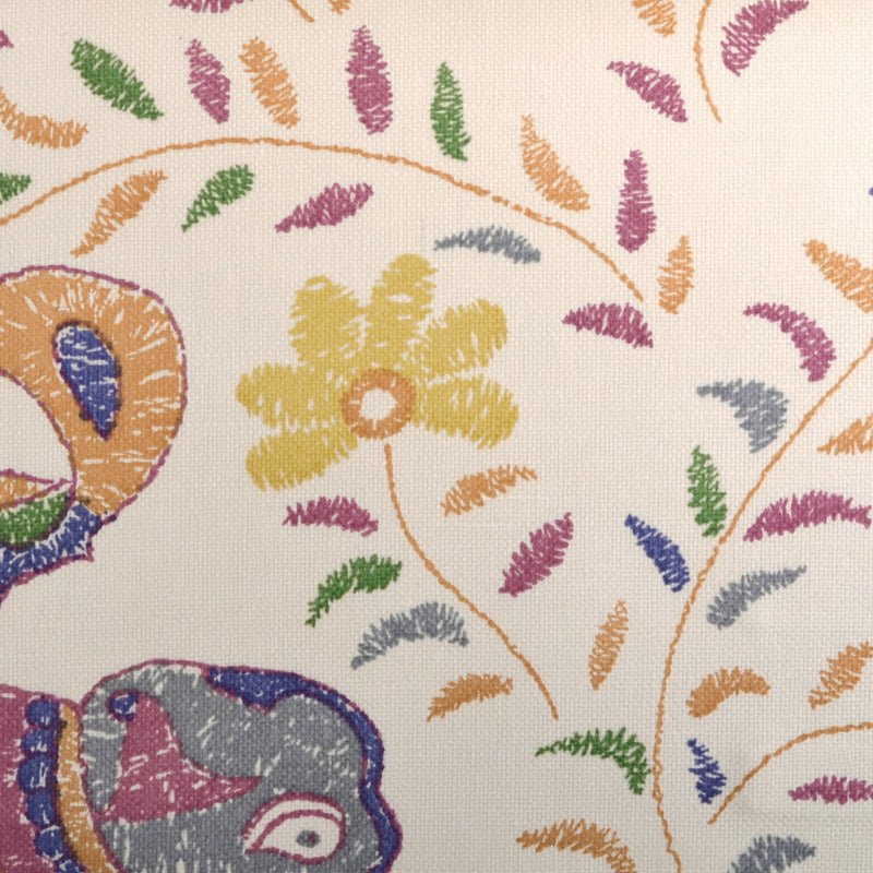 This multicolored floral print fabric features a charming palette of yellow, purple, green, orange, and...