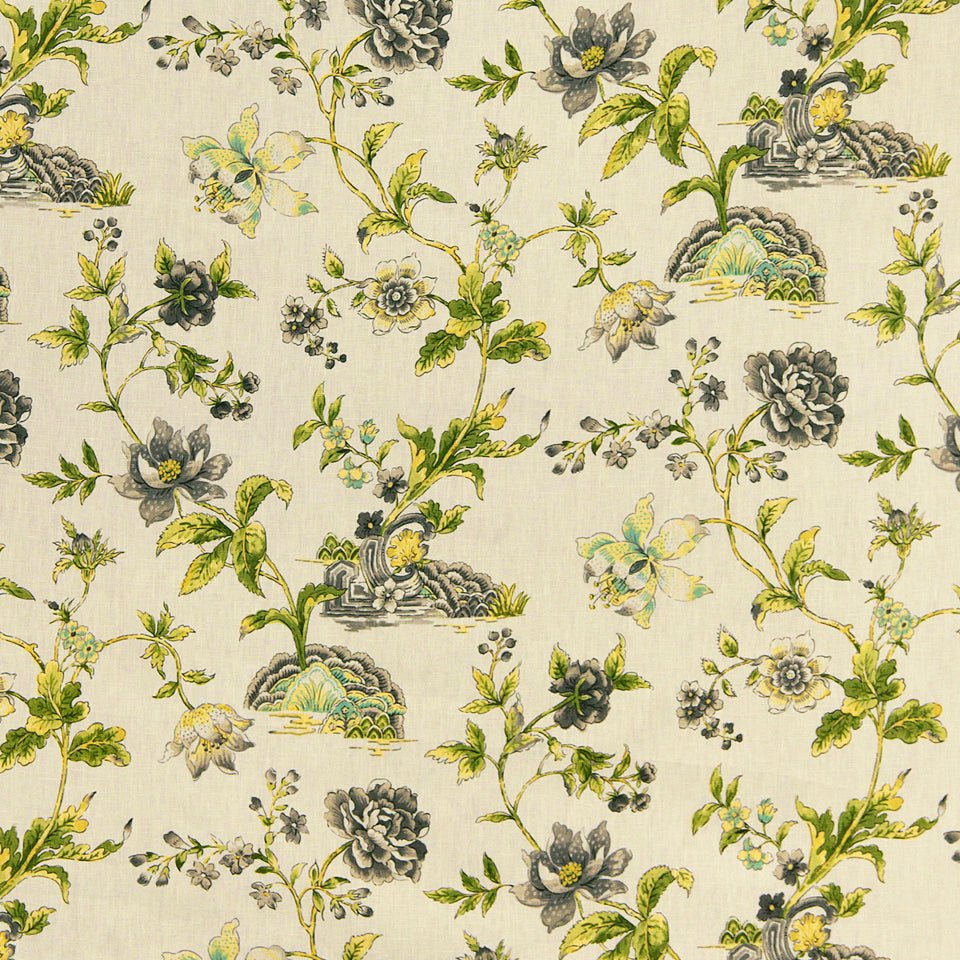 The Beale Garden multipurpose fabric features a striking citrine yellow and charcoal floral pattern on...