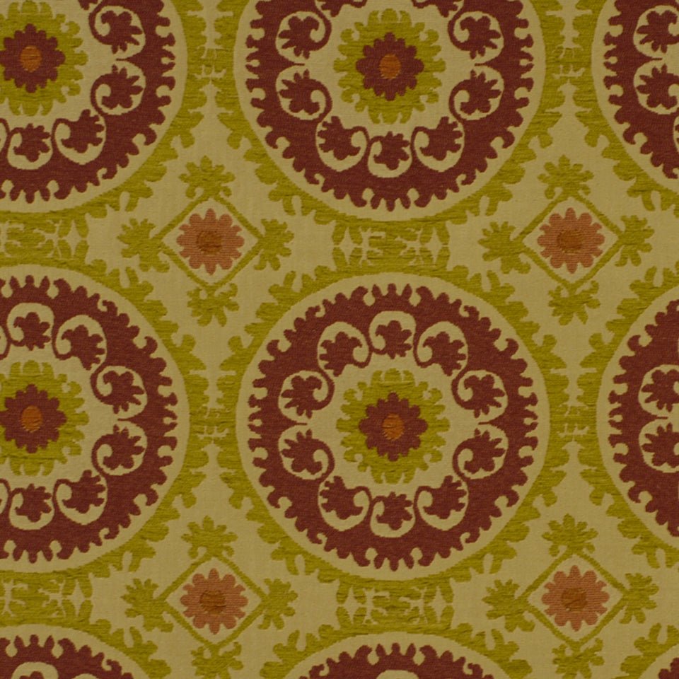The Seismic Sun upholstery fabric features a stunning global-inspired pattern in rich chili red, warm...
