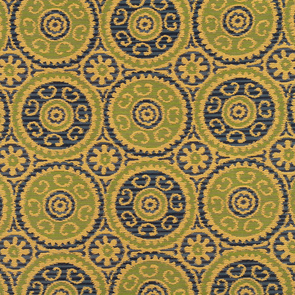 Circle Art upholstery fabric features a stunning global-inspired medallion pattern in warm gold, deep blue,...