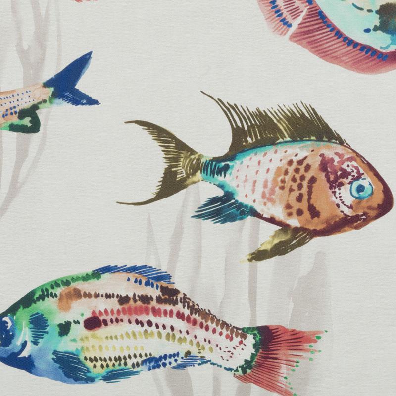 This vibrant Caribbean print cotton fabric features colorful tropical fish in shades of turquoise, coral,...