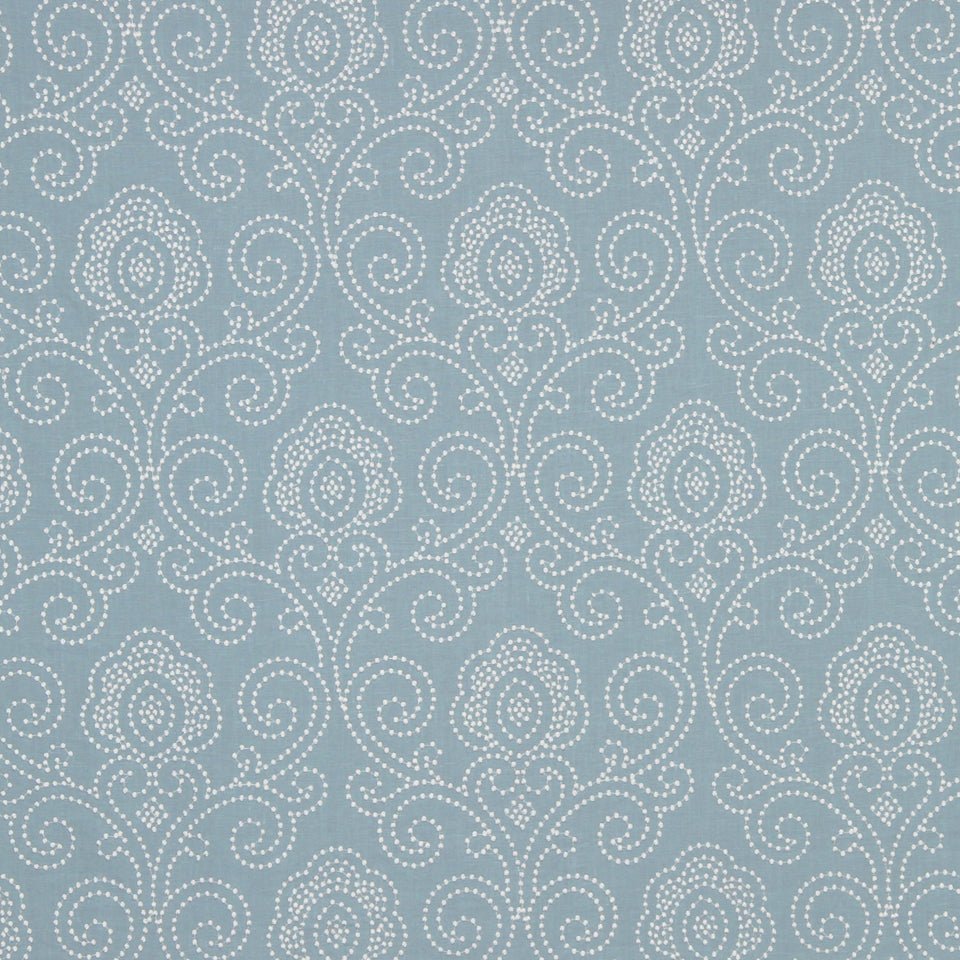 The Royal Curves multipurpose cotton fabric features an elegant scroll pattern in soft horizon blue...
