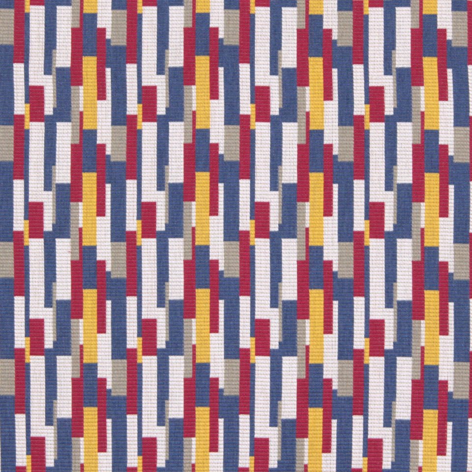 This cobalt blue geometric upholstery fabric features a striking pattern of stacked rectangles in rich...