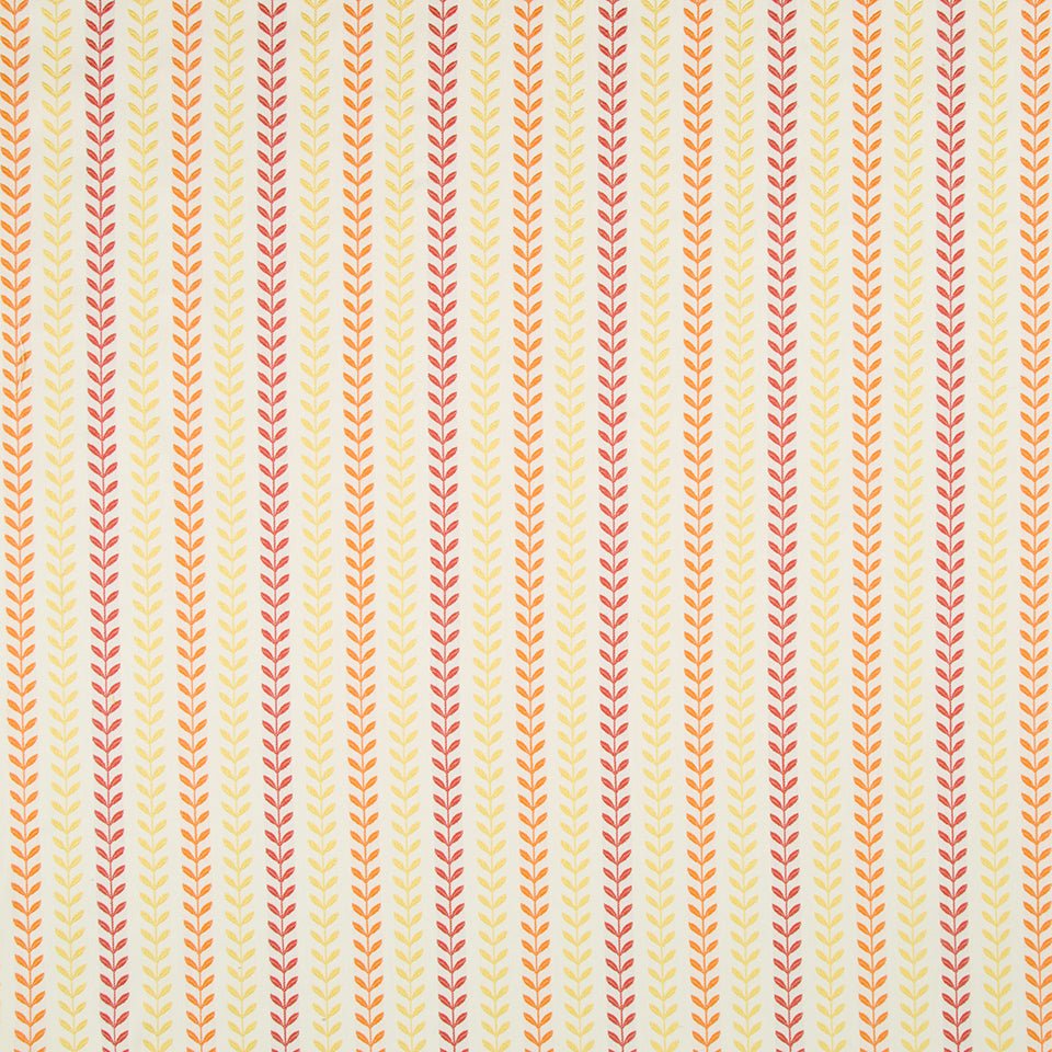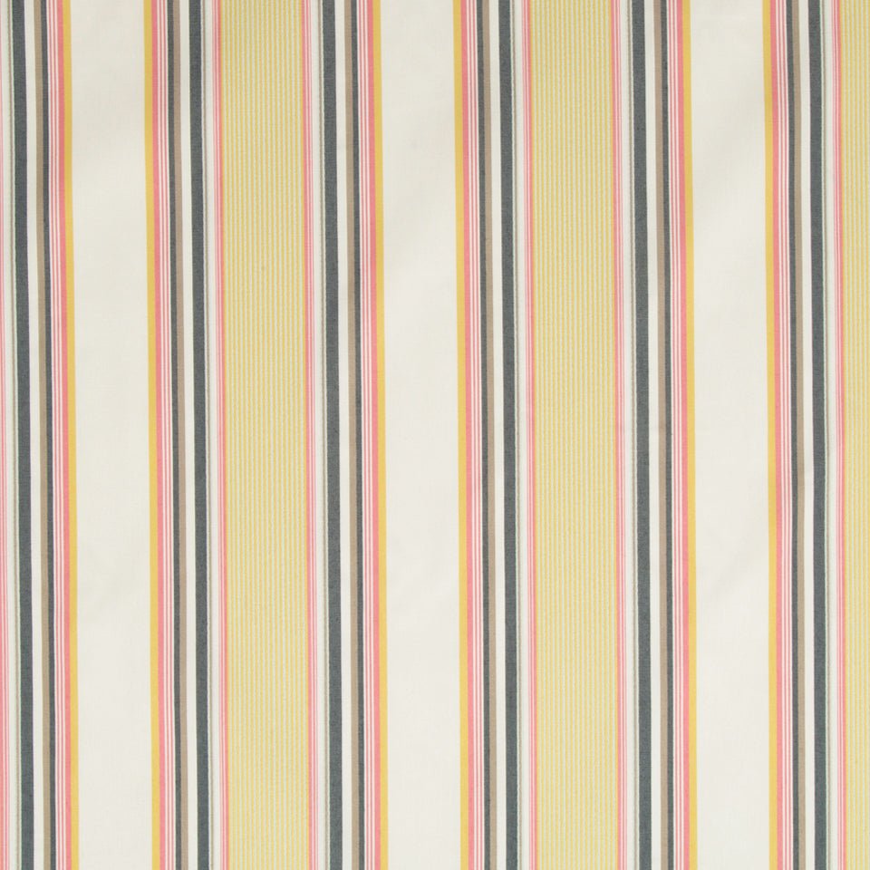 The Viney Lines upholstery fabric in Sunray features warm vertical stripes in golden yellow, coral...