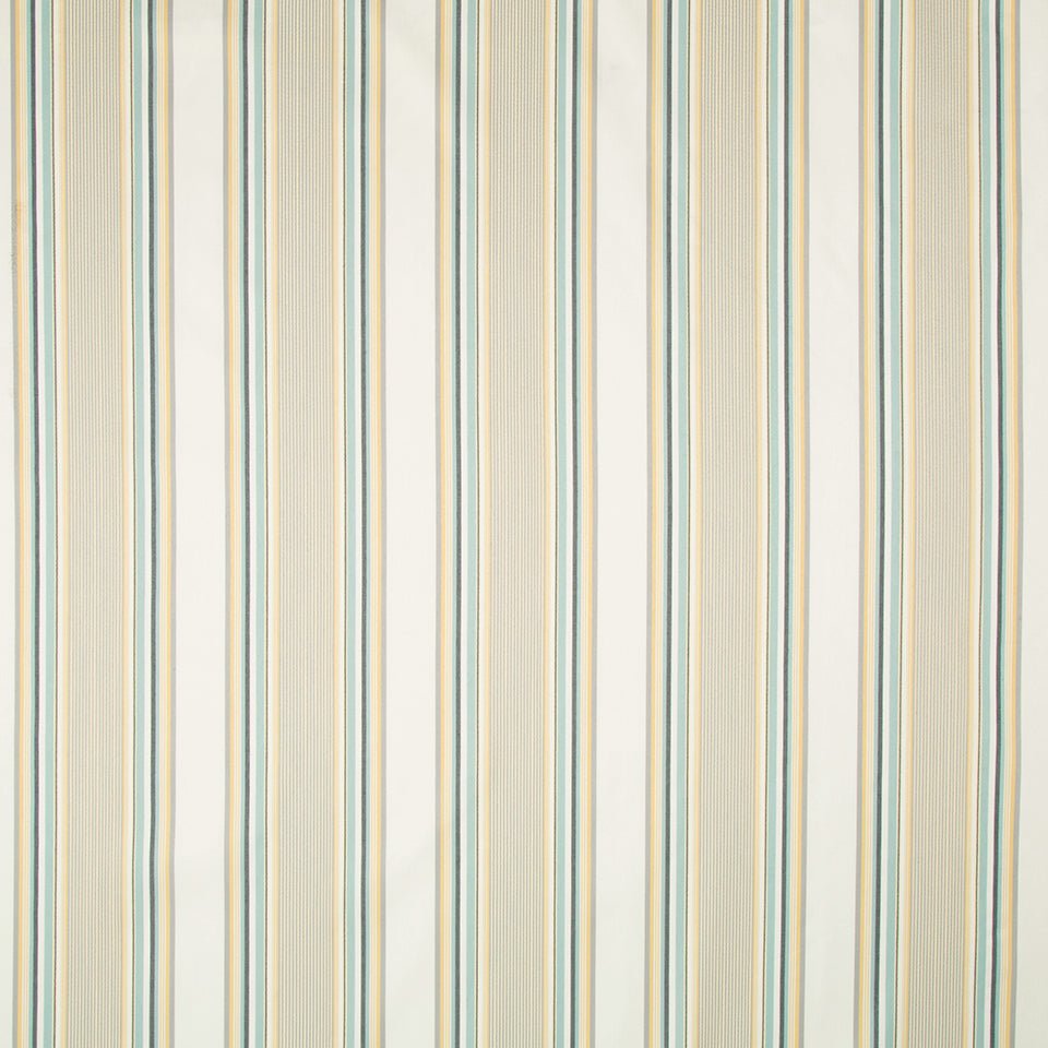 The Michiba Stripe upholstery fabric features elegant vertical stripes in water blue, cream, and soft...