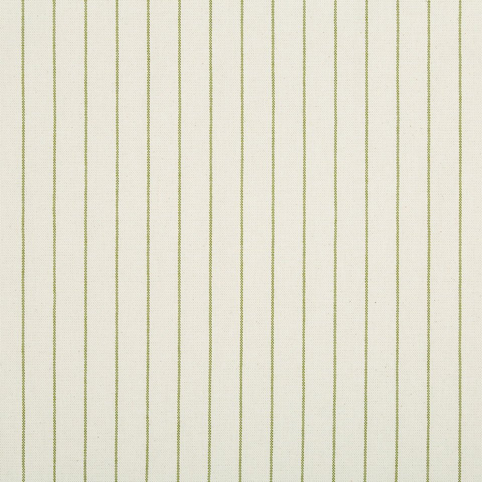 The AIMEE STRIPE upholstery fabric features a classic ticking stripe pattern in spring grass green...