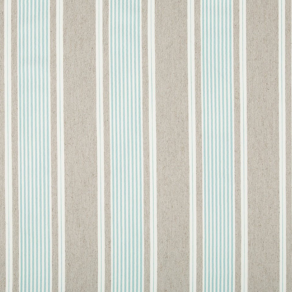 Little Brooke in Water features soft aqua and cream vertical stripes complemented by warm beige...