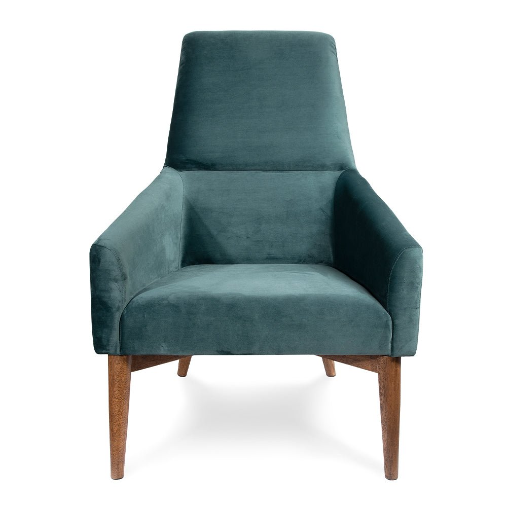 - Chicago accent chair, upholstered in fabric or leather and base in solid wood.