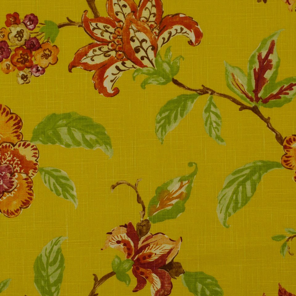Les Fauves in Sunshine features a vibrant yellow background with bold red and orange floral motifs accented by fresh green foliage, creating a cheerful botanical design. This linen and rayon blend is perfect for upholstery, decorative pillows, and window treatments that need to make a statement. The multipurpose fabric combines the durability of linen with rayon's elegant drape, ideal for both residential and light commercial applications.