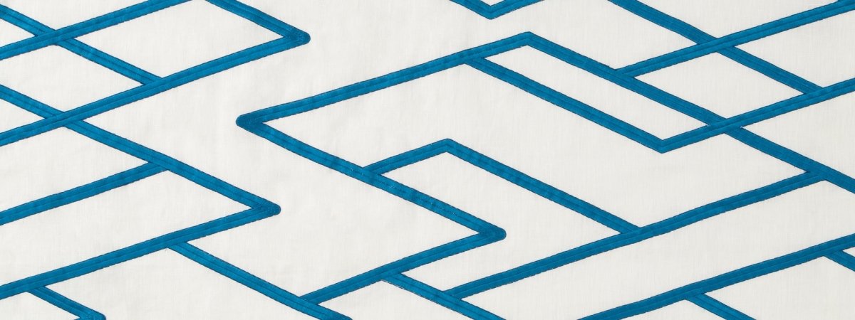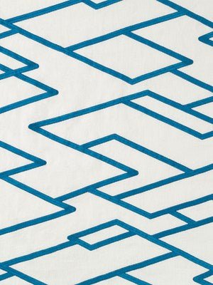 The Pinnacle fabric in Island Blue features bold geometric chevron stripes in a striking teal tone on a crisp white background. This 100% linen multipurpose fabric is perfect for upholstery, throw pillows, curtains, and window treatments. The modern pattern and natural linen construction provide both visual interest and lasting durability for any interior design project.