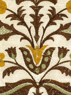 The Radiant Heart upholstery fabric features a sophisticated medallion floral pattern in warm date tones with golden yellows and deep burgundy accents on a cream background. This durable polyester-viscose blend is ideal for upholstering armchairs, creating decorative throw pillows, or designing custom window treatments. The elegant botanical motif brings timeless sophistication to any interior design project.