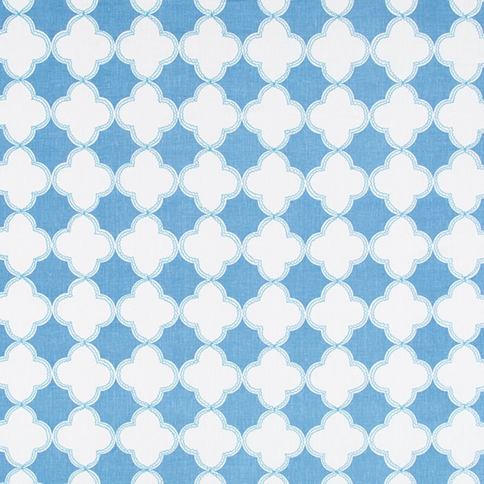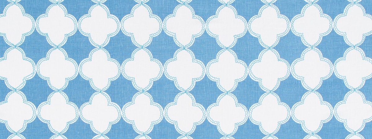 The SIMZA medallion fabric features a sophisticated azure blue and white color palette with a timeless geometric quatrefoil pattern. This versatile linen blend is perfect for upholstery, throw pillows, and window treatments, offering both durability and elegant style. The natural fiber content ensures a beautiful drape and lasting quality for any home decor project.