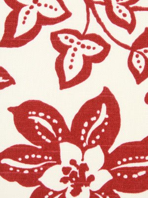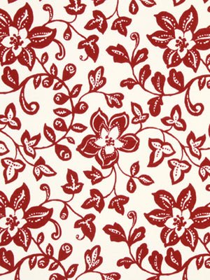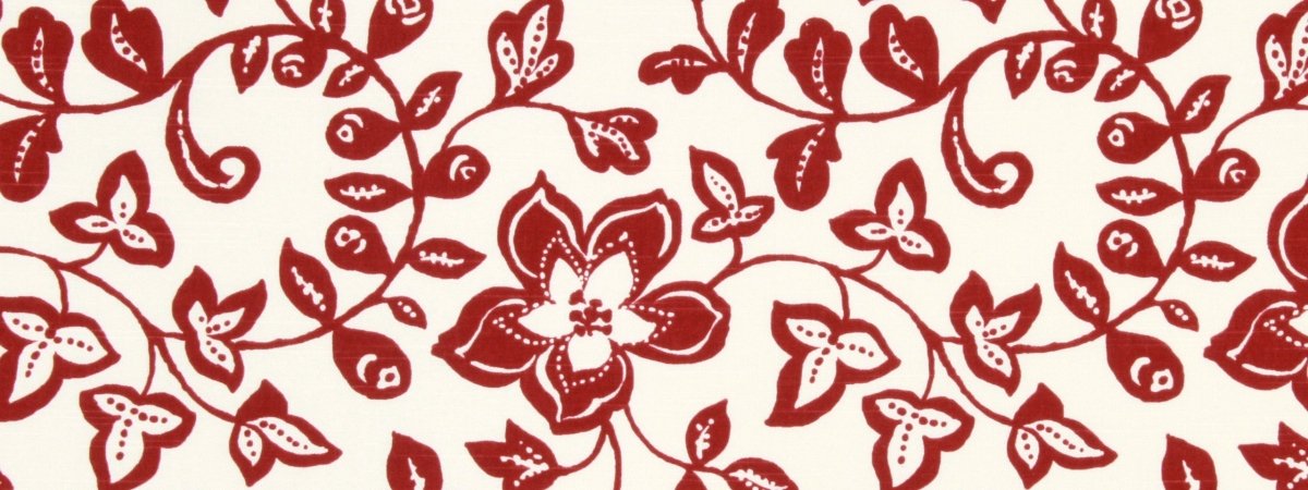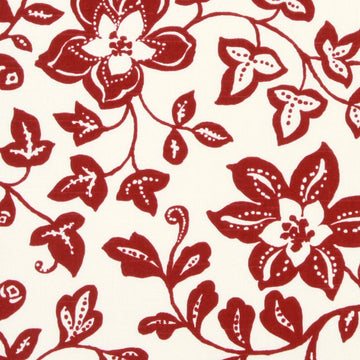 The Spring Toss multipurpose cotton fabric features a vibrant berry red and cream floral pattern with elegant dotted leaf details and curling vines. This versatile design is perfect for upholstery, throw pillows, curtain panels, and armchair coverings. The 100% cotton construction ensures durability and easy care for any home decor project.