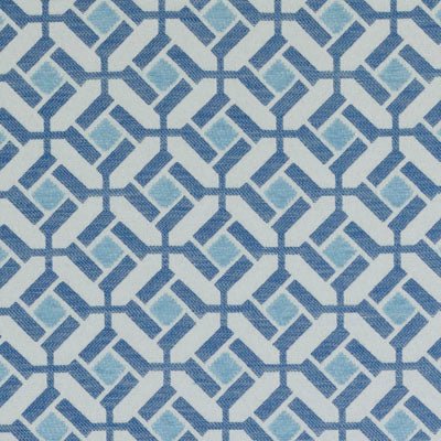 This azure and cream geometric upholstery fabric features an interlocking contemporary pattern that adds visual interest to any space. The 100% polyester blend is ideal for upholstered furniture, accent pillows, or decorative panels. Perfect for creating a fresh, modern look in living rooms, armchairs, or custom seating projects.