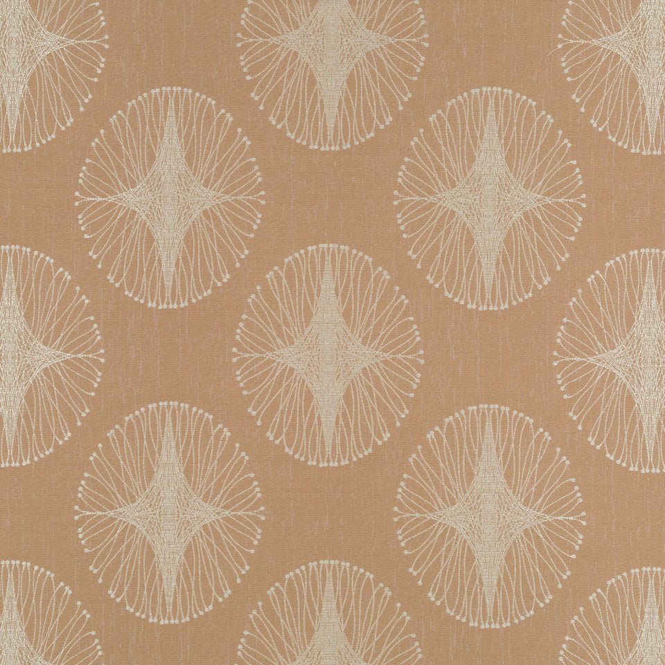 This elegant tea-toned upholstery fabric features a sophisticated medallion pattern with radiating line work in...