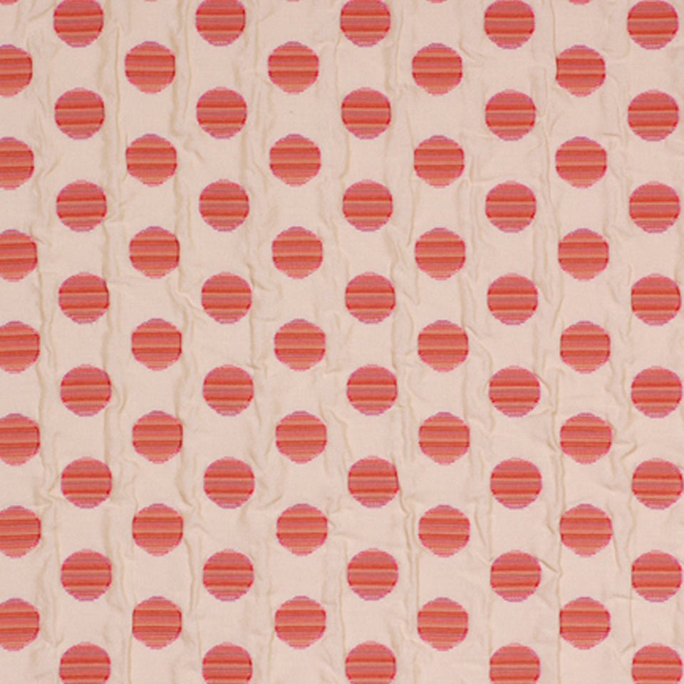 The Autumn Sphere upholstery fabric features a striking geometric pattern of coral and guava circles...