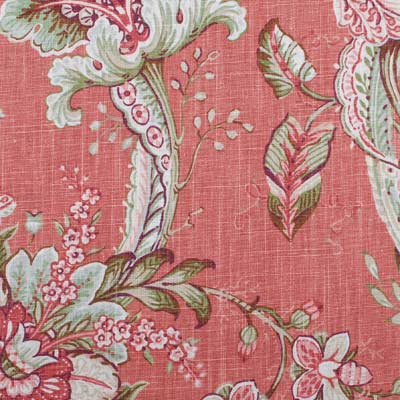 This melon floral print fabric features soft coral and cream tones with delicate botanical details and ornamental borders, blending 55% linen with 45% rayon for a refined finish. Perfect for upholstery, decorative pillows, curtains, and window treatments that need both elegance and durability. The linen-rayon blend offers excellent drape and a natural texture ideal for furniture panels and home decor projects.