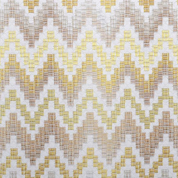 This banana yellow and tan flamestitch upholstery fabric features a sophisticated geometric diamond pattern in warm, earthy tones against a crisp white background. Perfect for reupholstering armchairs, creating decorative throw pillows, or crafting custom window treatments. The 100% polyester construction ensures durability and easy maintenance for high-traffic furniture applications.
