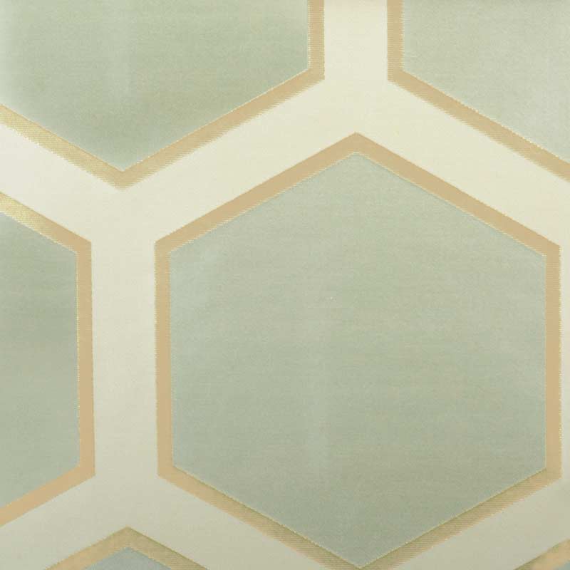 This seaglass drapery fabric features a sophisticated abstract hexagonal geometric pattern in soft sage green tones with cream and gold accents. The luxurious silk, lurex, and cotton blend makes it ideal for elegant window treatments, upholstered panels, and decorative pillows. Perfect for creating modern, refined looks in any interior space.