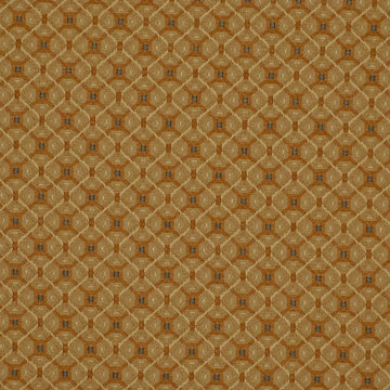 The BELDEN upholstery fabric features warm gold and rust tones with an elegant geometric diamond pattern accented by small blue details. This sophisticated design is perfect for armchairs, accent pillows, or furniture upholstery projects. The blend of 62% spun viscose and 38% polyester provides a durable yet soft fabric ideal for high-traffic home furnishings.