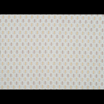 The CORFIELD Fountain upholstery fabric features a sophisticated palette of soft grey-blue tones accented with warm gold and rust-colored geometric leaf motifs. This 100% polyester global pattern is ideal for upholstered furniture, accent pillows, and window treatments in transitional or contemporary spaces. The durable polyester content makes it perfect for high-traffic upholstery applications while maintaining its refined aesthetic.