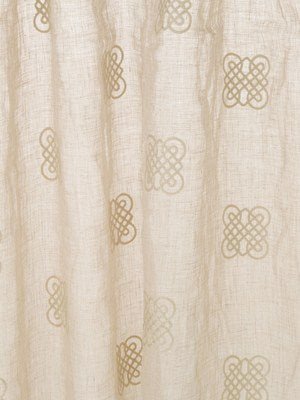 The Eight Square drapery fabric in Biscuit features elegant cream and tan tones with sophisticated geometric medallion embroidery. This luxurious blend of linen and viscose rayon is perfect for curtain panels, window treatments, and upholstery projects, offering a refined aesthetic for any room. The natural linen base provides excellent drape and durability, while the rayon embroidery adds delicate visual interest and texture.