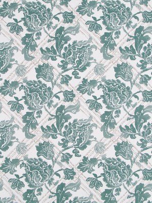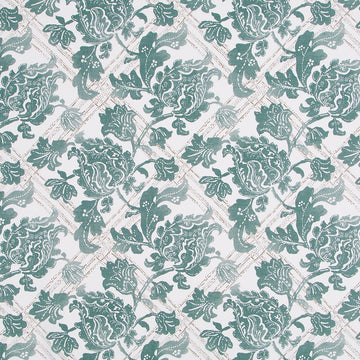 This aloe green and cream cotton print features an elegant floral lattice pattern with intricate botanical motifs and geometric grid details. Perfect for upholstery, throw pillows, and curtain panels, this 100% cotton fabric brings timeless style to any room. The sophisticated color palette and detailed pattern work beautifully for home décor projects.