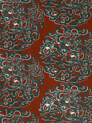 The Juvarra fabric in Henna features a rich palette of deep rust red, teal green, and cream with an intricate Asian-inspired scrollwork pattern. This versatile 100% cotton multipurpose fabric is ideal for upholstery projects, decorative pillows, and window treatments. The ornate baroque-style motifs add sophisticated elegance to any interior design scheme.