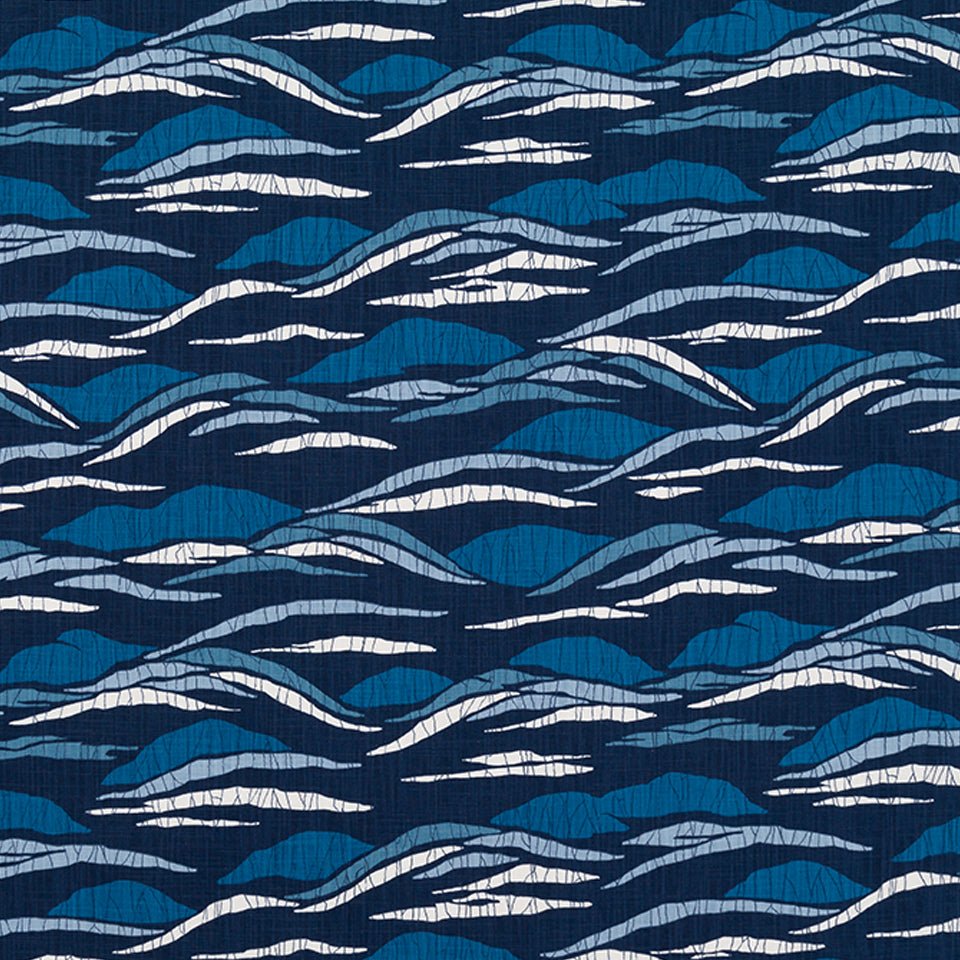 The Lotus Fields print in Lapis features rich deep blue tones layered with crisp white and gray sketched wave patterns, creating a sophisticated aquatic-inspired design. This 100% cotton fabric is ideal for upholstery projects, decorative pillows, and window treatments. The sketched print pattern brings artistic movement and contemporary style to any interior space.
