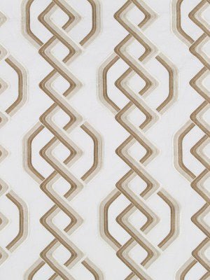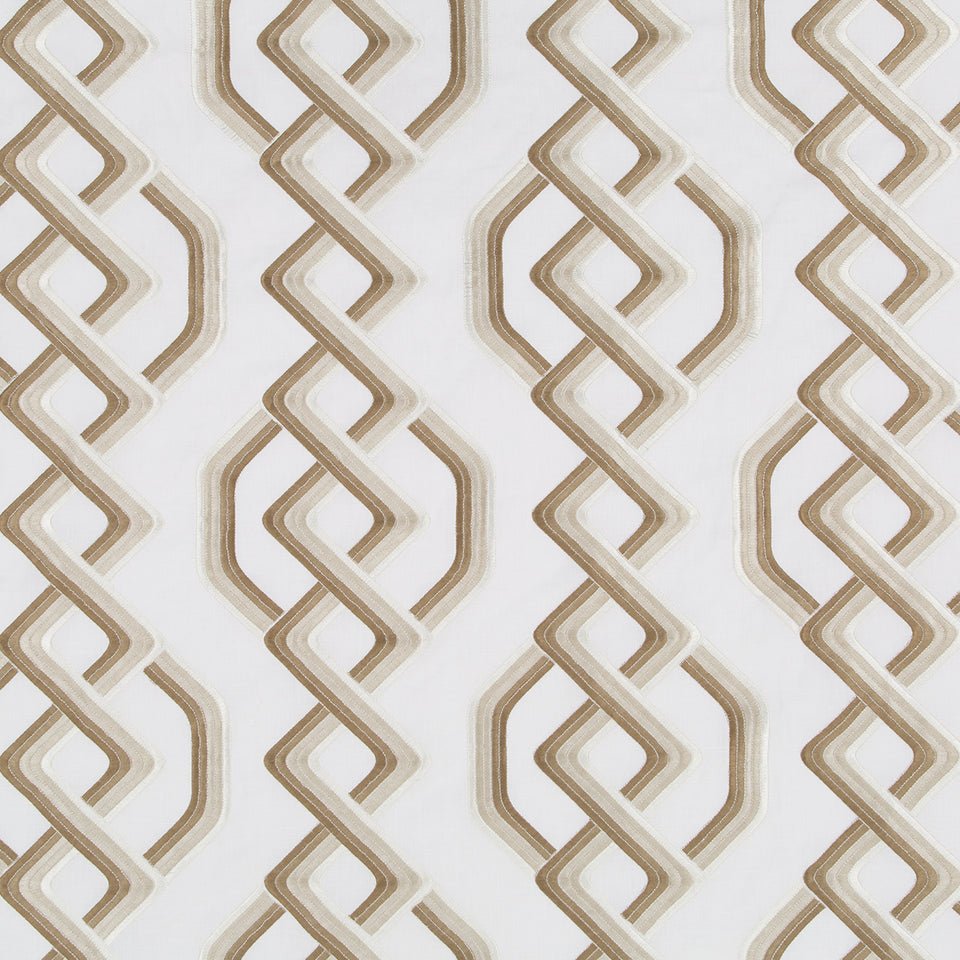 The Luxembourg multipurpose fabric features an elegant geometric trellis pattern in warm honey, cream, and taupe tones on a natural ivory ground. This linen-cotton blend with viscose embroidery is perfect for upholstery, decorative pillows, and window treatments. Its sophisticated design and durable composition make it ideal for both residential and commercial interior projects.