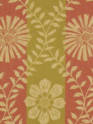 The MENDOCINO upholstery fabric in Citrus features warm terra cotta and olive green tones with elegant botanical motifs, including radiating sunflowers and delicate leafy vines. This polyester-rayon blend is perfect for upholstered furniture, decorative pillows, and window treatments. Its durable composition and sophisticated pattern make it ideal for both residential and commercial interior design projects.