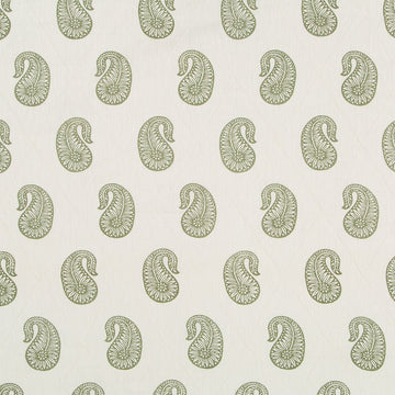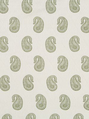 PAZETTE is a sophisticated moss green and cream multipurpose linen fabric featuring an intricate paisley pattern with ornamental detailing. Perfect for upholstery projects, decorative pillows, curtains, and window treatments, this linen-rich blend offers durability and elegant style. The natural linen content ensures beautiful drape and lasting quality for any interior design application.