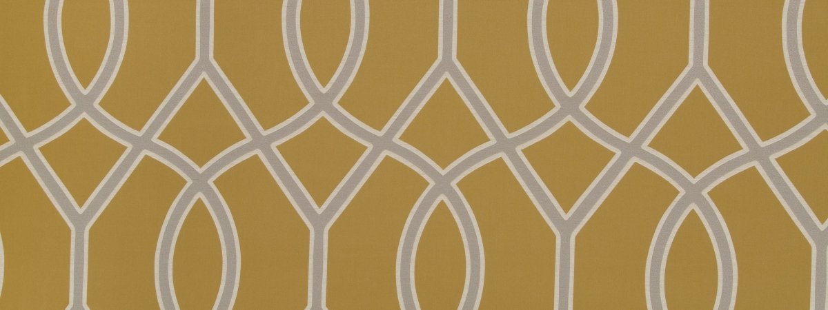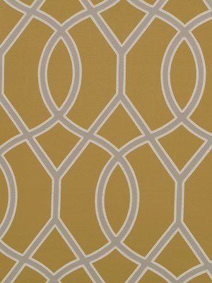 STARGATE drapery fabric features a sophisticated geometric trellis pattern in warm 14 Karat gold with crisp silvery-gray lines creating an elegant, modern aesthetic. This 100% polyester flame-resistant fabric is perfect for window treatments, curtain panels, and upholstered accent pieces. Ideal for contemporary interiors, the durable drapery fabric combines style with practical performance for residential and commercial applications.