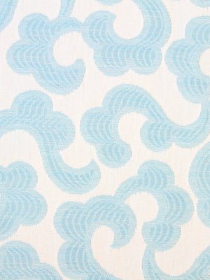 The Tranquil Flower upholstery fabric features a soft blue opal color palette with elegant white scroll patterns that create a calm, sophisticated aesthetic. This cotton-rayon blend is ideal for upholstered furniture, decorative pillows, and window treatments. The versatile scroll pattern and serene colorway make it perfect for adding refined elegance to any interior space.