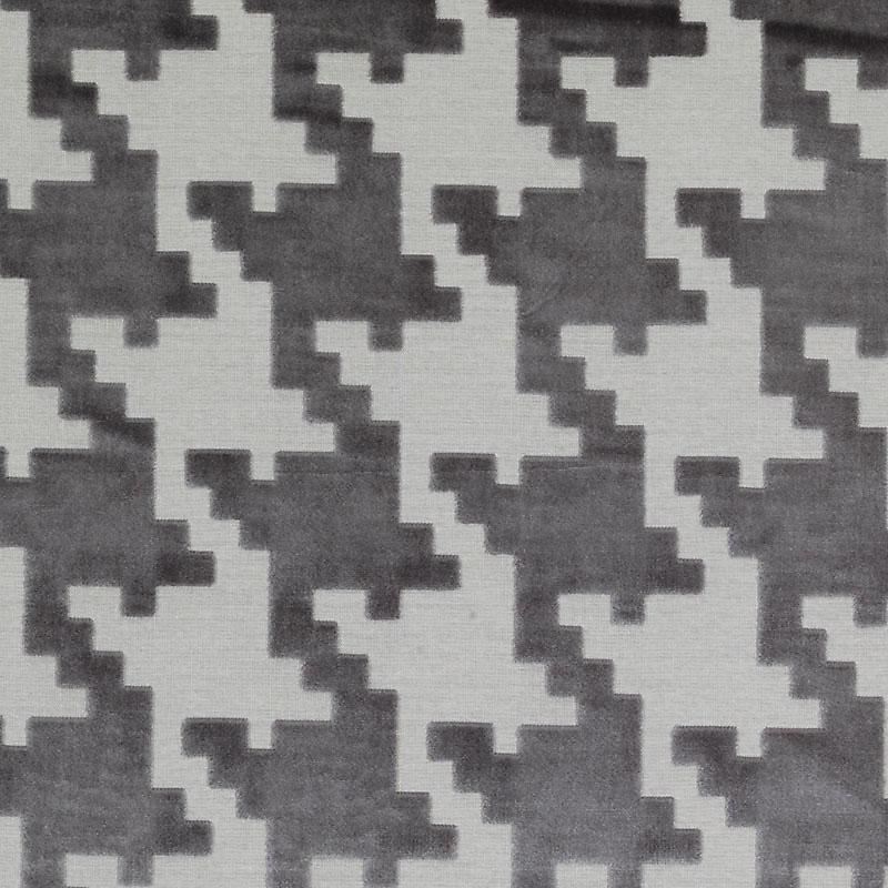 This zinc and cream houndstooth velvet upholstery fabric features a classic abstract pattern with sophisticated charcoal tones. Perfect for armchairs, accent pillows, and furniture upholstery projects. The luxurious viscose-polyester blend combines softness with durability for long-lasting elegance.