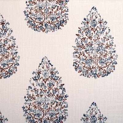 This indigo and burgundy floral print fabric features a sophisticated botanical design on a natural linen-rayon blend, creating an elegant color palette perfect for traditional and transitional interiors. Ideal for upholstery, curtain panels, and decorative pillow covers. The balanced fiber content provides durability and a refined drape suitable for furniture projects and window treatments.