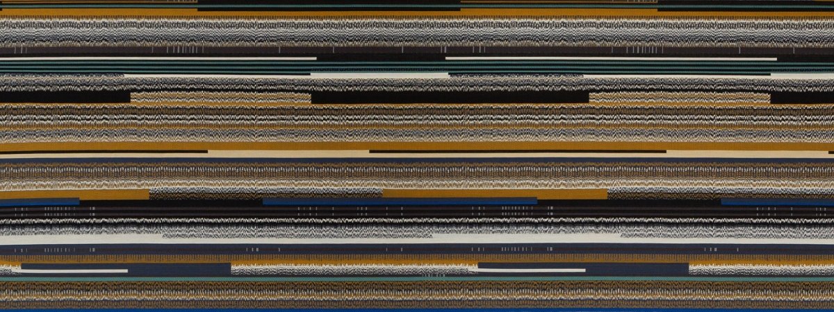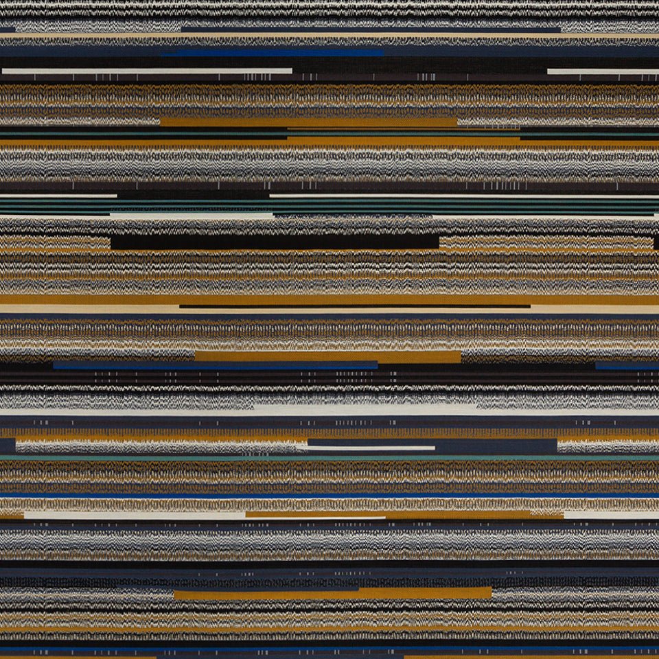 The ARRAS upholstery fabric in Oasis features a sophisticated striped pattern combining warm golden tones, cool navy blues, and neutral grays across a refined weave. This durable cotton-nylon blend is perfect for upholstering armchairs, sofas, or creating accent pillows and window treatments. The balanced fiber content ensures excellent durability and maintains its color vibrancy through regular use.