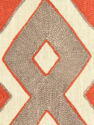 The Carmane fabric in Cayenne features a striking geometric diamond pattern in vibrant red-orange tones accented with warm gray and cream, creating a dynamic visual rhythm. This multipurpose linen-viscose blend is ideal for upholstery, accent pillows, curtains, and window treatments. The balanced fiber composition ensures durability and a refined drape suitable for both contemporary and transitional interiors.