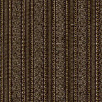 The ELKANAH upholstery fabric showcases a sophisticated blend of deep brown and golden olive tones with a striking global geometric diamond pattern accented by vertical stripes. This durable polyester-rayon blend is perfect for upholstering armchairs, sectionals, or creating statement throw pillows and window treatments. The intricate woven texture adds depth and visual interest to any interior design project.
