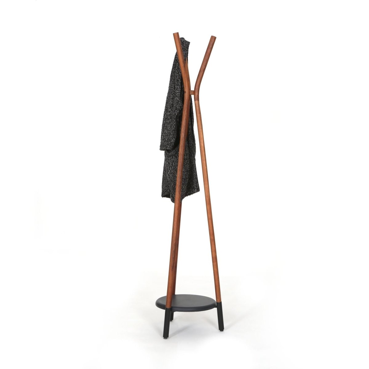 LAN is a simple, elegant coat rack with a concrete base and a solid wood structure that is available in two sizes. Dimensions: 62.9โH x 20.8โC