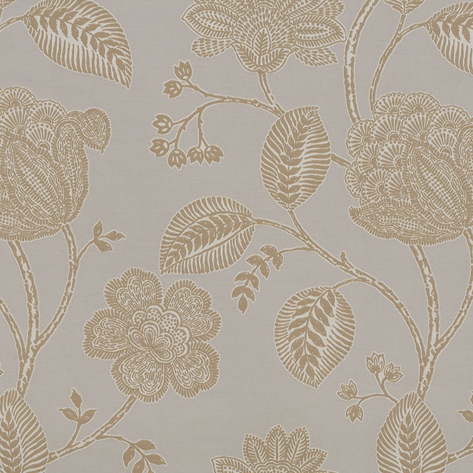 The NAVINA upholstery fabric features an elegant truffle and cream color palette with intricate botanical floral patterns and detailed leaf motifs. This versatile 50% cotton, 25% linen, and 25% viscose blend is perfect for upholstery projects, decorative pillows, and window treatments. The sophisticated line-drawn florals and natural fiber content provide both durability and refined aesthetic appeal for furniture and home decor applications.
