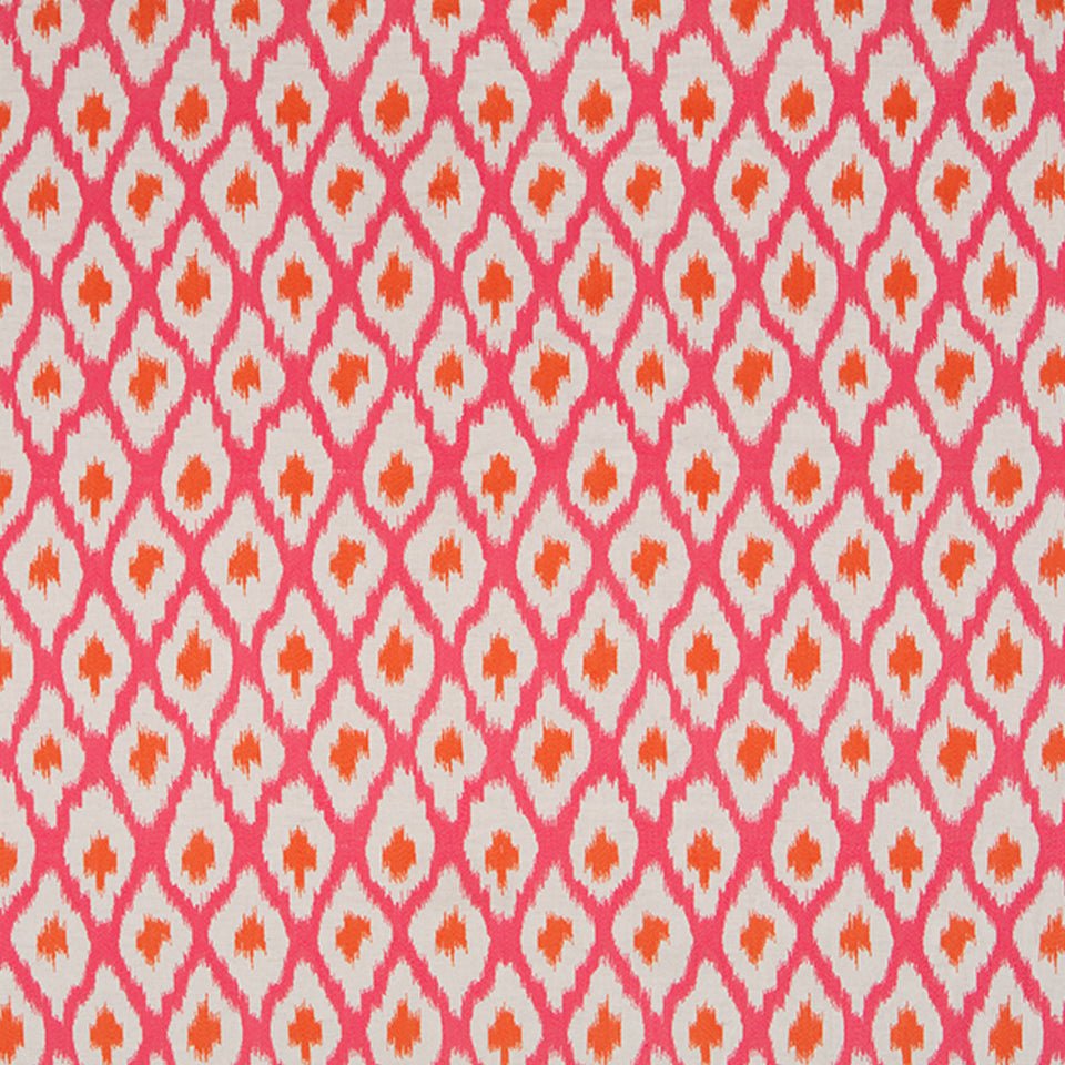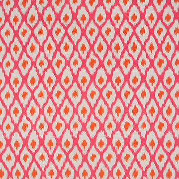 The Ogee Stitchery in Peony features vibrant coral and orange tones on a soft cream background with an intricate ikat-inspired geometric pattern. This versatile linen-cotton blend with polyester embroidery accents is perfect for upholstery, decorative pillows, and window treatments. The balanced composition of natural fibers ensures durability and a refined drape ideal for both contemporary and global-inspired interiors.