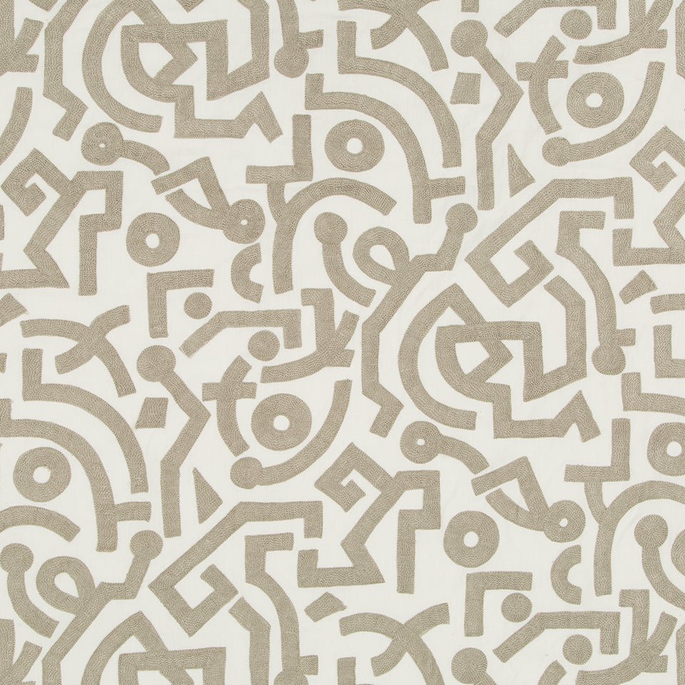 SAMBA STEP in Honey features a sophisticated geometric pattern in warm taupe and cream tones, perfect for contemporary and global-inspired interiors. This multipurpose linen-cotton blend with viscose embroidery is ideal for upholstery, throw pillows, and window treatments. The durable 55% linen and 45% cotton ground provides excellent structure and longevity for furniture and home décor projects.