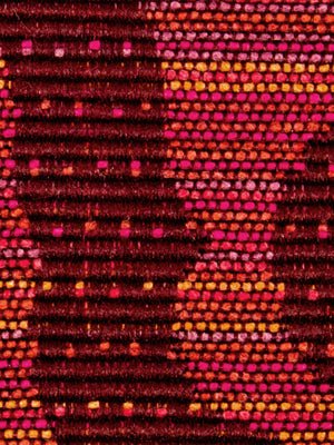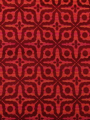 The Strie Fleur upholstery fabric in Petal showcases rich red and burgundy tones with an intricate geometric pattern featuring quatrefoil medallions and ornamental details. This 50% acrylic and 50% polyester blend is perfect for upholstering armchairs, creating decorative pillows, or designing statement window treatments. The durable fabric combines classic elegance with modern versatility for any sophisticated interior project.