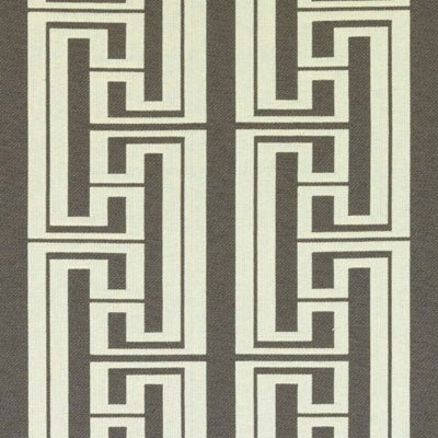 This graphite and cream Greek key upholstery fabric features a sophisticated geometric pattern with nested rectangular motifs in neutral tones. Perfect for armchairs, sofas, cushions, or decorative panels, the design adds classic elegance to any interior. The polyester-cotton blend ensures durability and easy maintenance for everyday use.