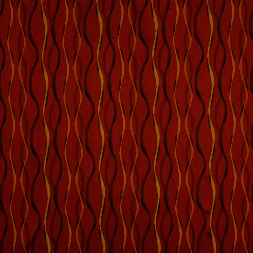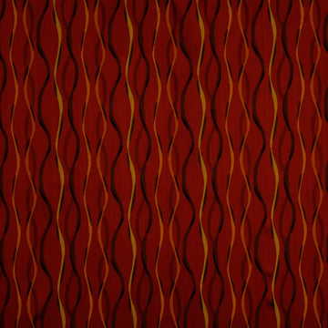 The Transformation fabric in Ruby features rich deep red tones with elegant gold and charcoal wavy stripe patterns, creating a sophisticated multipurpose textile. Perfect for upholstery projects, decorative pillows, curtains, and window treatments. This 100% polyester fabric combines durability with a luxurious appearance ideal for both residential and commercial applications.