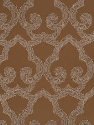 Tucked Frame features an elegant bronze and cream color palette with intricate scrolled geometric patterns, offering sophisticated visual depth on a warm neutral background. This versatile multipurpose polyester fabric is ideal for upholstery, throw pillows, curtains, and window treatments. The flame-resistant polyester construction ensures durability and easy maintenance for residential and commercial applications.